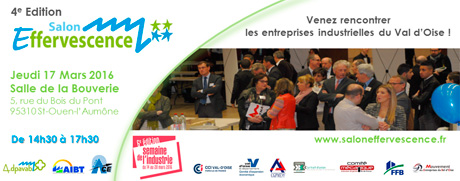 Le jeudi 17 mars : Journée d’échanges business, le salon Effervescence se tiendra à Saint-Ouen l’Aumône (Bouverie). L’ADPAVAB (association des industriels d’Argenteuil – Bezons) s’est rapprochée de deux autres associations d’entrepreneurs, l’AIBT (Beauchamp Taverny) et le club ACE, pour organiser la quatrième édition de ce salon professionnel, consacré aux métiers de l’industrie et aux services à l’industrie.