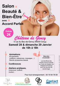 Nadège Gross, fondatrice de la société Accord Parfait, agence de conseil en image, organise les 28 et 29 janvier 2017, de 10h à 18h, au Château de Gency à Cergy, son 4e salon beauté et bien-être, qui regroupera une quarantaine d’exposants soigneusement sélectionnés, avec un panel complet de praticiens et de professionnels du Val d’Oise (esthétique, maquillage, coiffure, réflexologie, massage,langage corporel, hypnothérapie…). Des ateliers “découverte” et des conférences enrichissantes se dérouleront tout au long de la journée. L’intégralité des recettes (2€/personne) ira au fonds de dotation de l’hôpital de Pontoise (service de cancérologie). Cet événement permettra à ceux qui le souhaitent de trouver sur place les conseils qu’ils recherchent en matière de bien-être extérieur et intérieur.